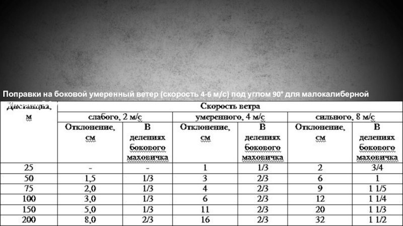 Слайд 7Поправки на ветер для стрельбы из малокалиберной винтовки (полная таблица)