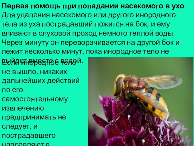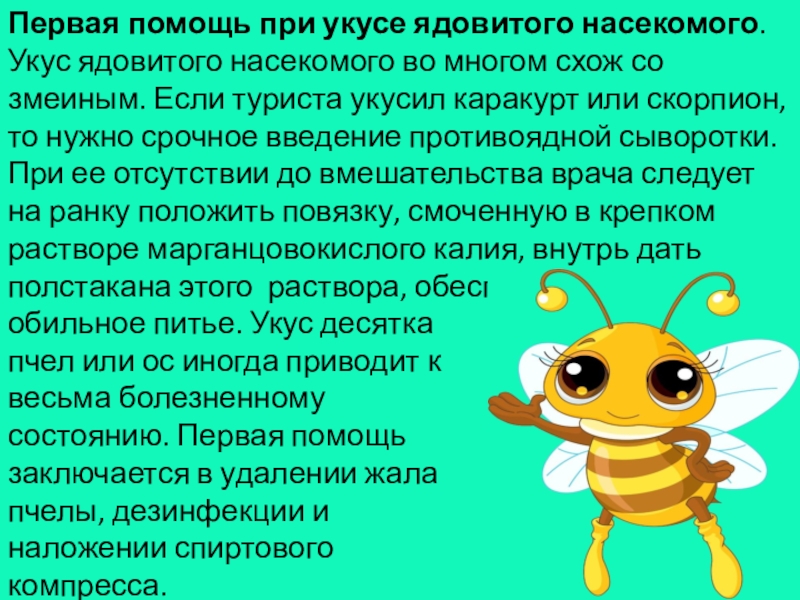 обильное питье. Укус десятка пчел или ос иногда приводит к весьма болезненному состоянию. Первая помощь заключается в удалении жала пчелы, дезинфекции и наложении спиртового компресса.