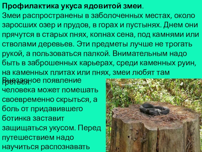 Внезапное появление человека может помешать своевременно скрыться, а боль от придавившего ботинка заставит защищаться укусом. Перед путешествием надо научиться распознавать ядовитых и безобидных.