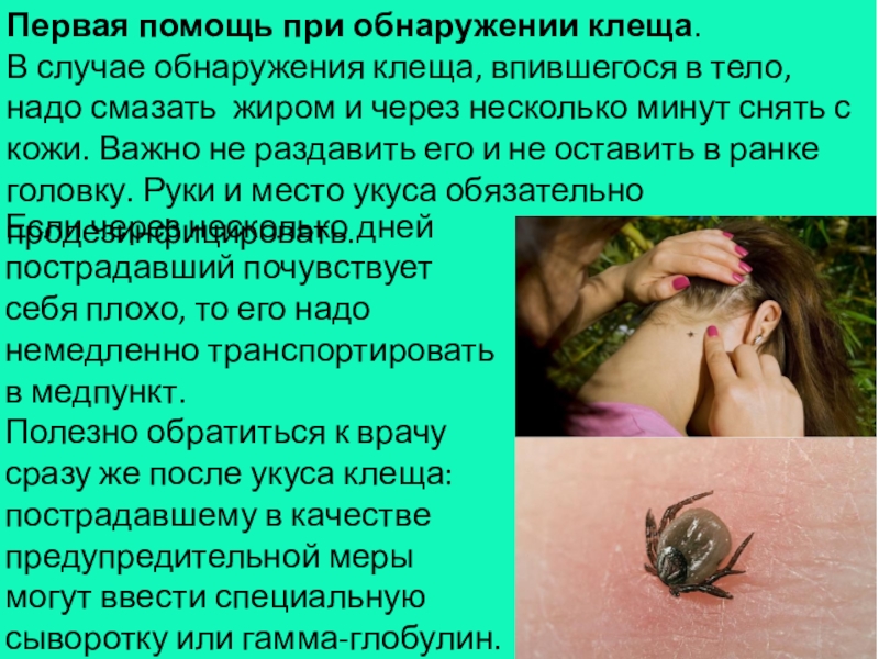 Полезно обратиться к врачу сразу же после укуса клеща: пострадавшему в качестве предупредительной меры могут ввести специальную сыворотку или гамма-глобулин.