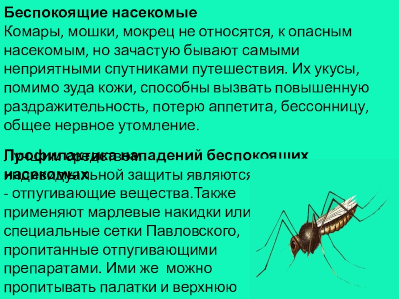 Лучшим средством индивидуальной защиты являются - отпугивающие вещества.Также применяют марлевые накидки или специальные сетки Павловского, пропитанные отпугивающими препаратами. Ими же можно пропитывать палатки и верхнюю одежду.