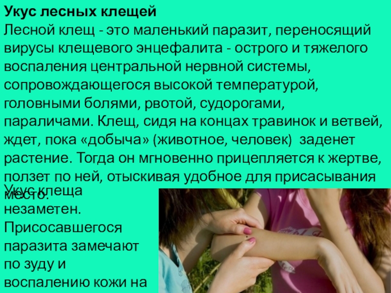 Укус клеща незаметен. Присосавшегося паразита замечают по зуду и воспалению кожи на 2-3 сутки.