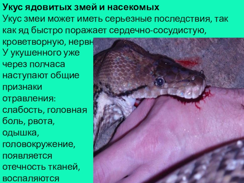 У укушенного уже через полчаса наступают общие признаки отравления: слабость, головная боль, рвота, одышка, головокружение, появляется отечность тканей, воспаляются лимфатические железы.