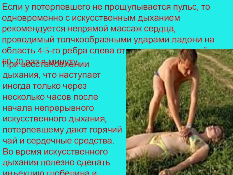животом на согнутое колено и несколько раз надавливают на спину) и освобождают грудь от стесняющей одежды, делают искусственное дыхание.