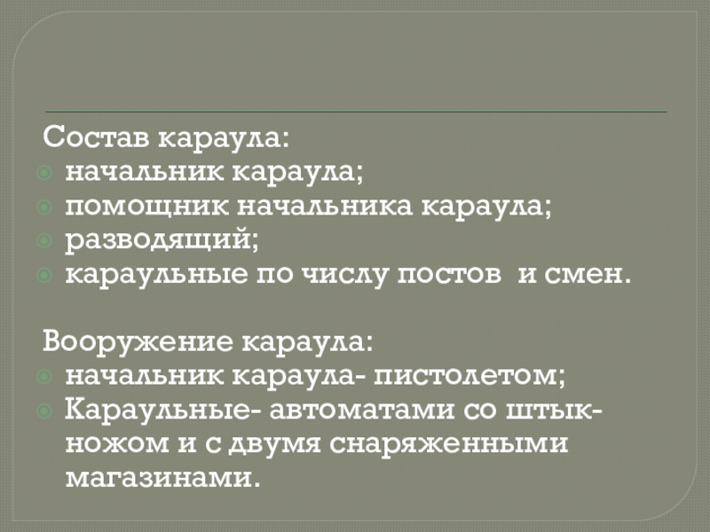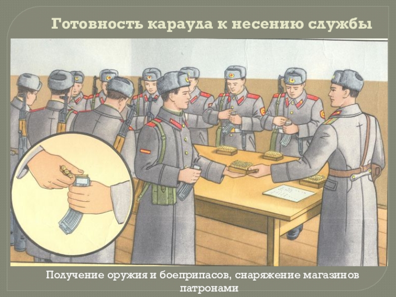 Караульные- автоматами со штык-ножом и с двумя снаряженными магазинами.