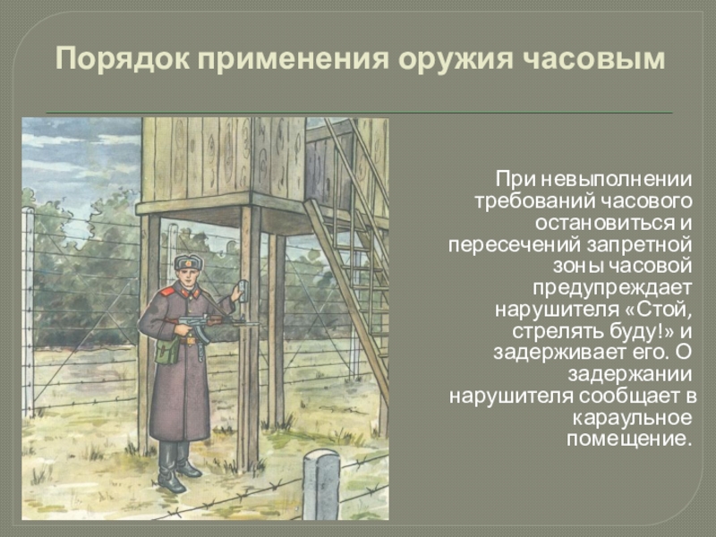зоны часовой предупреждает нарушителя «Стой, стрелять буду!» и задерживает его. О задержании нарушителя сообщает в караульное помещение.