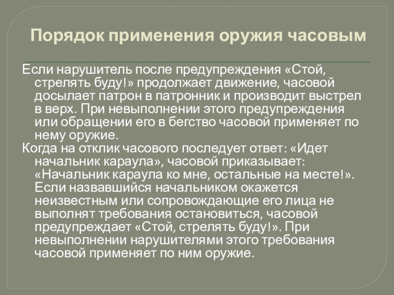 движение, часовой досылает патрон в патронник и производит выстрел в верх. При невыполнении этого предупреждения или обращении его в бегство часовой применяет по нему оружие.