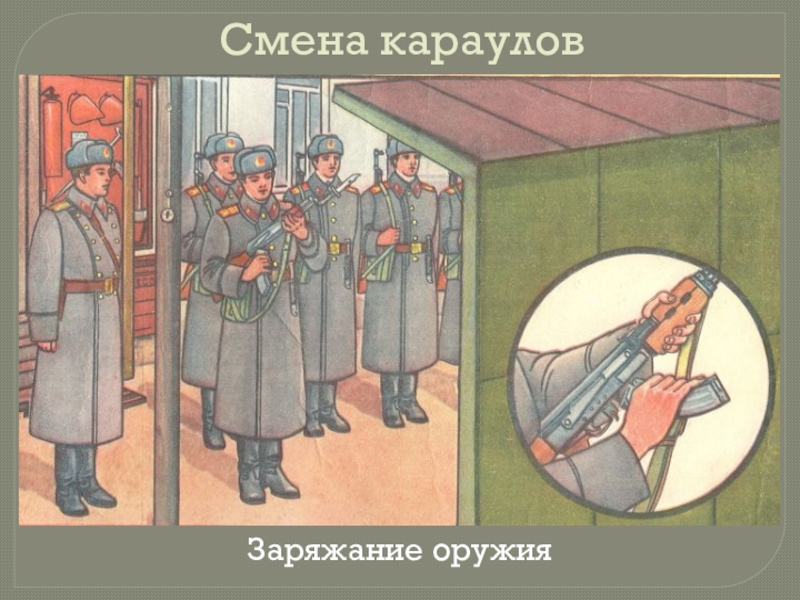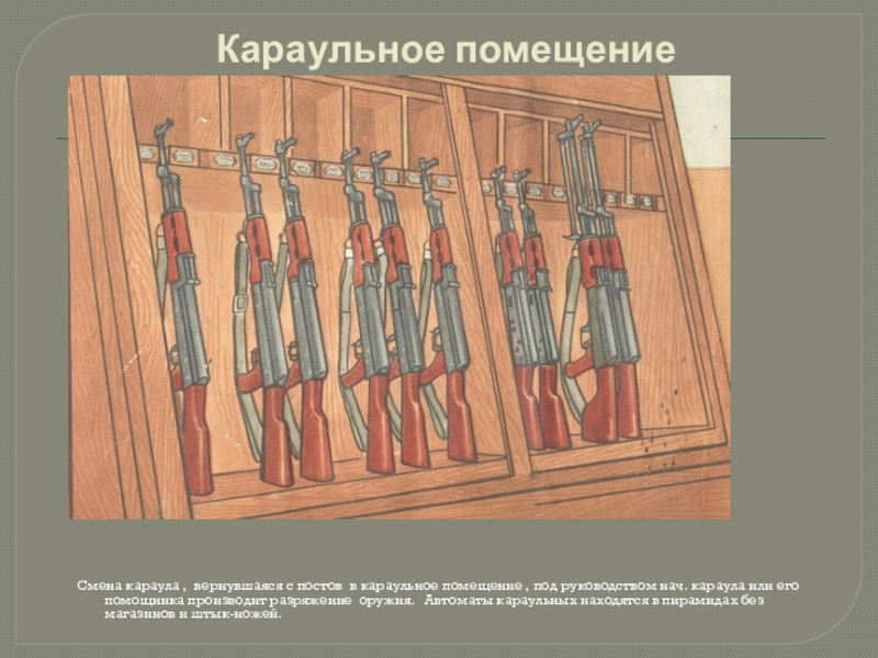 под руководством нач. караула или его помощника производит разряжение оружия. Автоматы караульных находятся в пирамидах без магазинов и штык-ножей.
