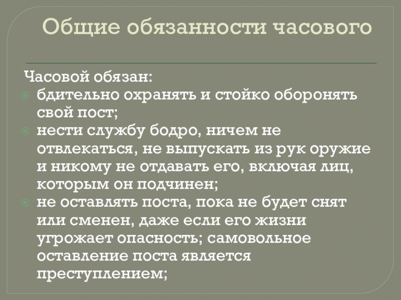 не оставлять поста, пока не будет снят или сменен, даже если его жизни угрожает опасность; самовольное оставление поста является преступлением;