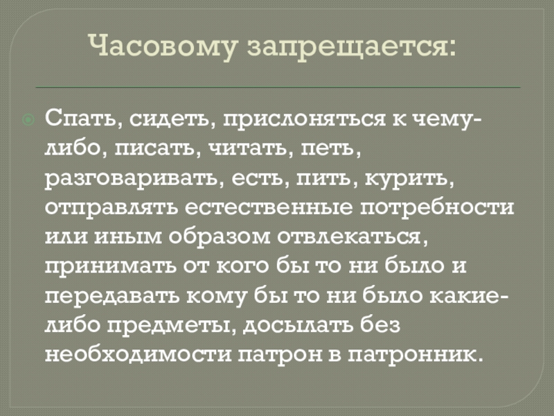 пить, курить, отправлять естественные потребности или иным образом отвлекаться, принимать от кого бы то ни было и передавать кому бы то ни было какие-либо предметы, досылать без необходимости патрон в патронник.