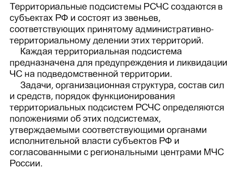 Задачи, организационная структура, состав сил и средств, порядок функционирования территориальных подсистем РСЧС определяются положениями об этих подсистемах, утверждаемыми соответствующими органами исполнительной власти субъектов РФ и согласованными с региональными центрами МЧС России.