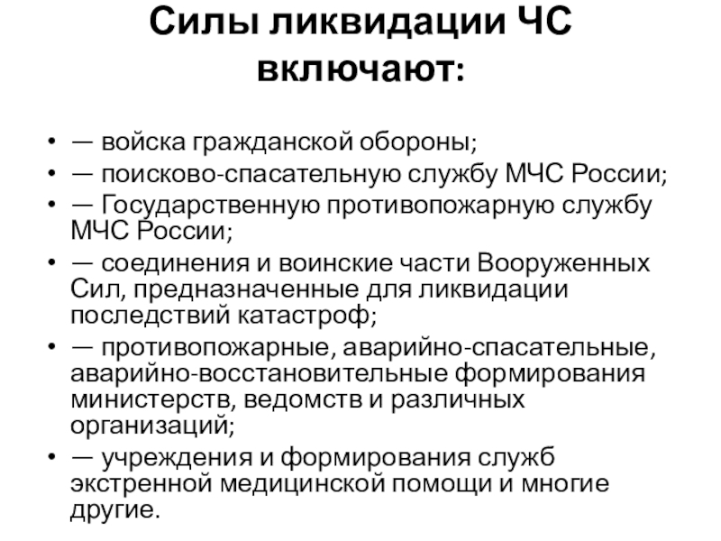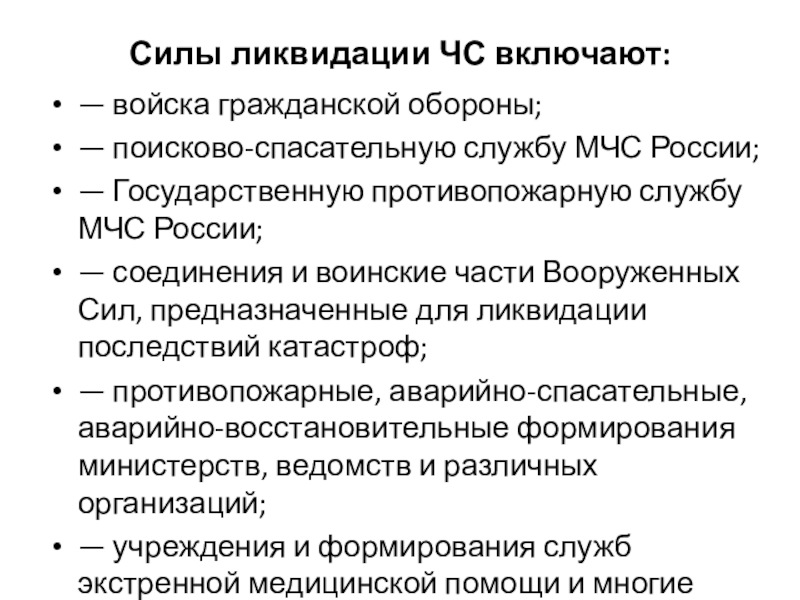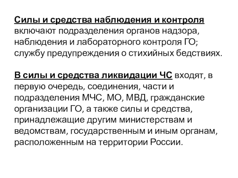 В силы и средства ликвидации ЧС входят, в первую очередь, соединения, части и подразделения МЧС, МО, МВД, гражданские организации ГО, а также силы и средства, принадлежащие другим министерствам и ведомствам, государственным и иным органам, расположенным на территории России.