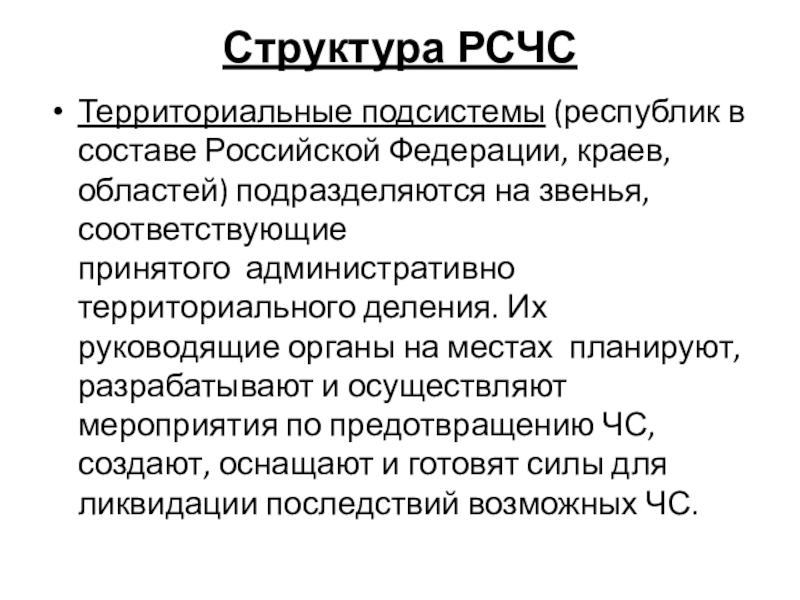 Слайд 7Территориальные подсистемы РСЧС создаются в субъектах РФ и состоят из звеньев,