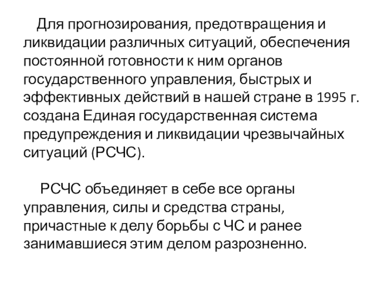 ним органов государственного управления, быстрых и эффективных действий в нашей стране в 1995 г. создана Единая государственная система предупреждения и ликвидации чрезвычайных ситуаций (РСЧС).