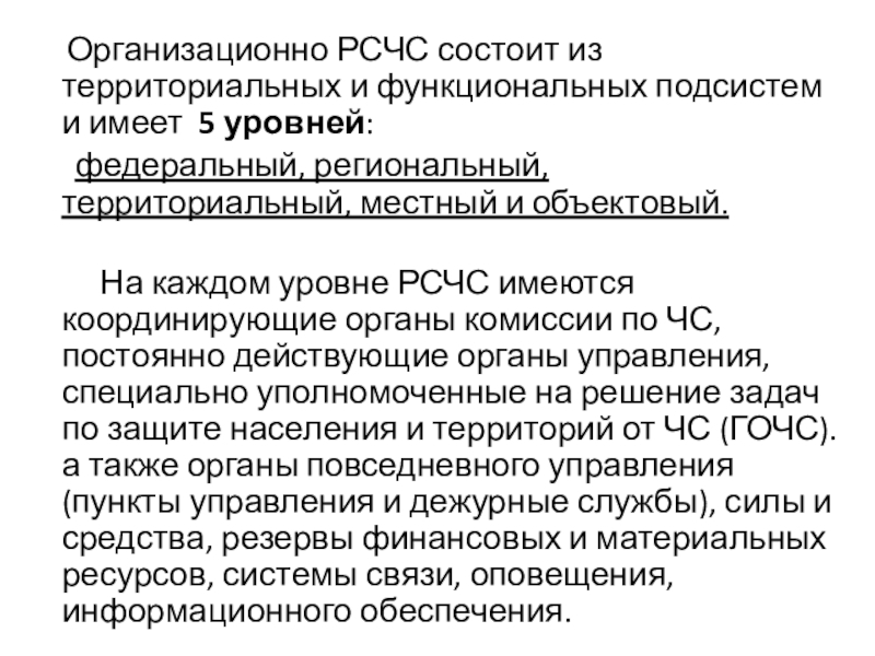 Слайд 4 Организационно РСЧС состоит из территориальных и функциональных подсистем и имеет 5
