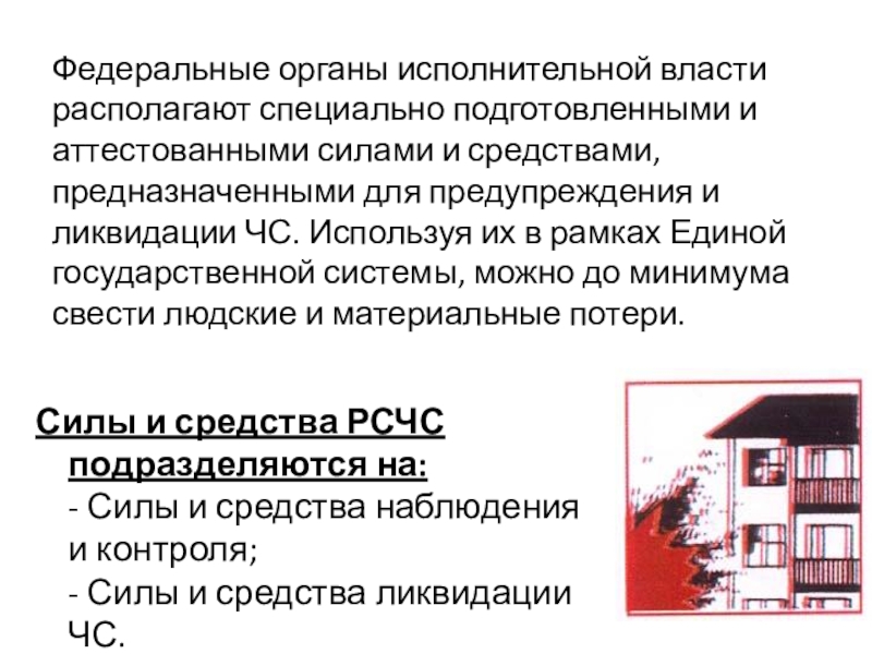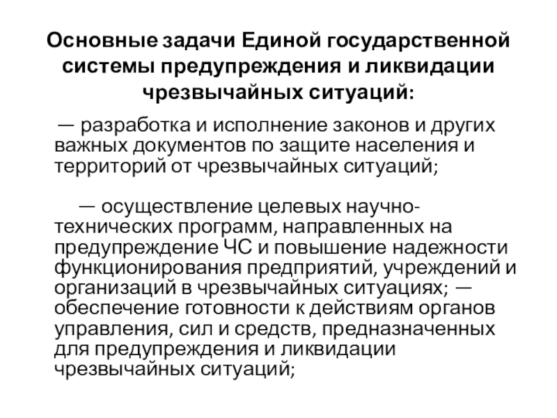 — осуществление целевых научно-технических программ, направленных на предупреждение ЧС и повышение надежности функционирования предприятий, учреждений и организаций в чрезвычайных ситуациях; — обеспечение готовности к действиям органов управления, сил и средств, предназначенных для предупреждения и ликвидации чрезвычайных ситуаций;