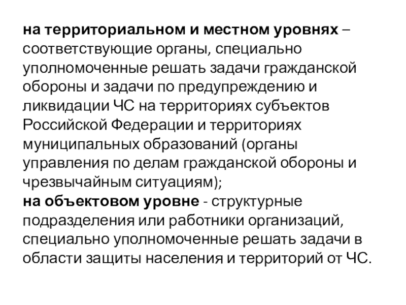 задачи гражданской обороны и задачи по предупреждению и ликвидации ЧС на территориях субъектов Российской Федерации и территориях муниципальных образований (органы управления по делам гражданской обороны и чрезвычайным ситуациям);