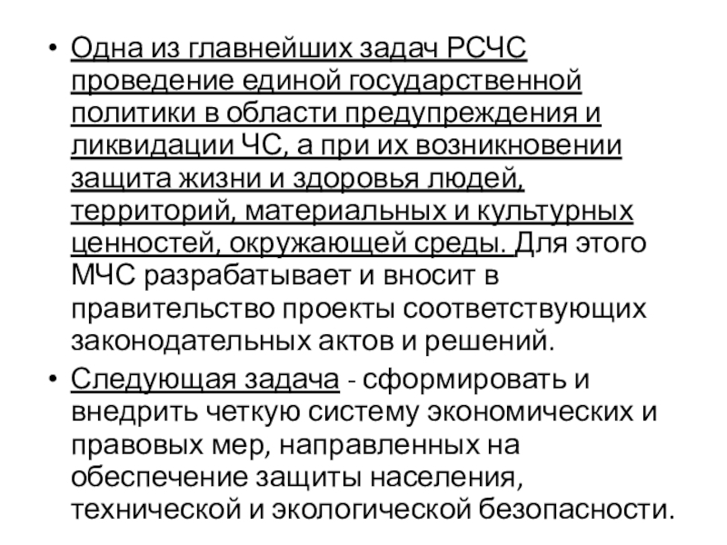 предупреждения и ликвидации ЧС, а при их возникновении защита жизни и здоровья людей, территорий, материальных и культурных ценностей, окружающей среды. Для этого МЧС разрабатывает и вносит в правительство проекты соответствующих законодательных актов и решений.