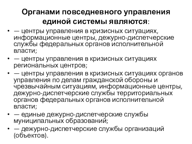 — центры управления в кризисных ситуациях органов управления по делам гражданской обороны и чрезвычайным ситуациям, информационные центры, дежурно-диспетчерские службы территориальных органов федеральных органов исполнительной власти;
