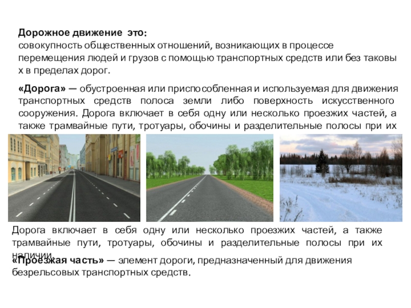 «Проезжая часть» — элемент дороги, предназначенный для движения безрельсовых транспортных средств.