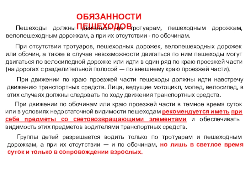 Группы детей разрешается водить только по тротуарам и пешеходным дорожкам, а при их отсутствии — и по обочинам, но лишь в светлое время суток и только в сопровождении взрослых.