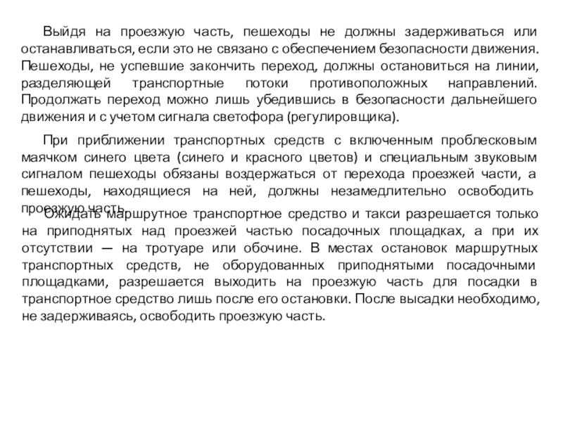 Ожидать маршрутное транспортное средство и такси разрешается только на приподнятых над проезжей частью посадочных площадках, а при их отсутствии — на тротуаре или обочине. В местах остановок маршрутных транспортных средств, не оборудованных приподнятыми посадочными площадками, разрешается выходить на проезжую часть для посадки в транспортное средство лишь после его остановки. После высадки необходимо, не задерживаясь, освободить проезжую часть.