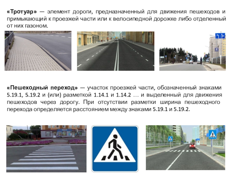 «Пешеходный переход» — участок проезжей части, обозначенный знаками 5.19.1, 5.19.2 и (или) разметкой 1.14.1 и 1.14.2 … и выделенный для движения пешеходов через дорогу. При отсутствии разметки ширина пешеходного перехода определяется расстоянием между знаками 5.19.1 и 5.19.2.