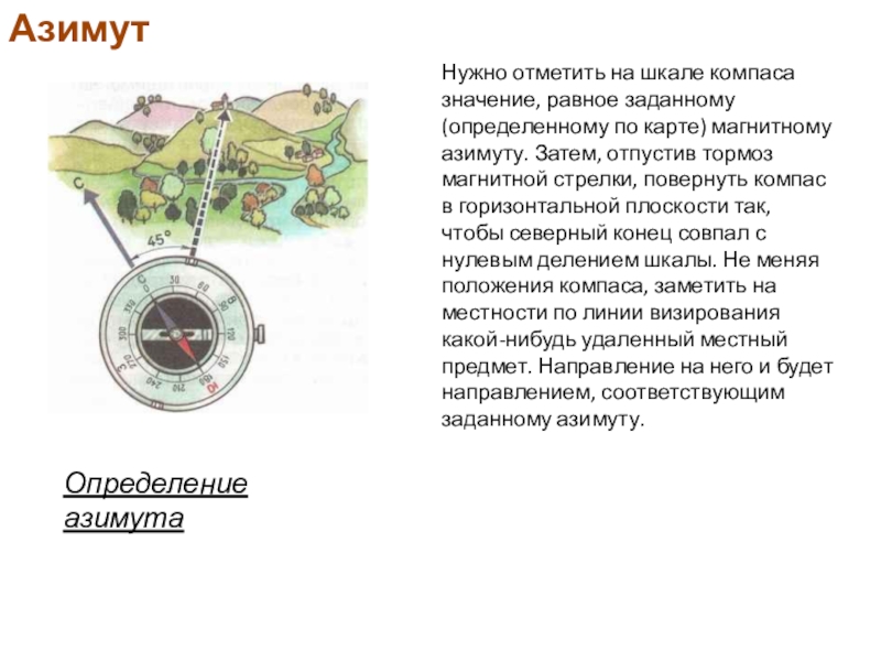 Ориентирование на местности предполагает, кроме определения сторон горизонта, определение своего местонахождения относительно окружающих предметов и рельефа, а также выбор нужного направления движения.