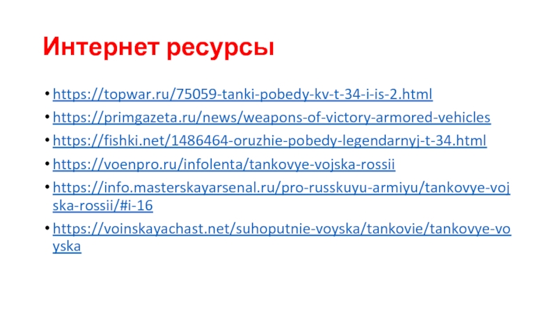 Интернет ресурсыhttps://topwar.ru/75059-tanki-pobedy-kv-t-34-i-is-2.htmlhttps://primgazeta.ru/news/weapons-of-victory-armored-vehicleshttps://fishki.net/1486464-oruzhie-pobedy-legendarnyj-t-34.htmlhttps://voenpro.ru/infolenta/tankovye-vojska-rossiihttps://info.masterskayarsenal.ru/pro-russkuyu-armiyu/tankovye-vojska-rossii/#i-16https://voinskayachast.net/suhoputnie-voyska/tankovie/tankovye-voyska