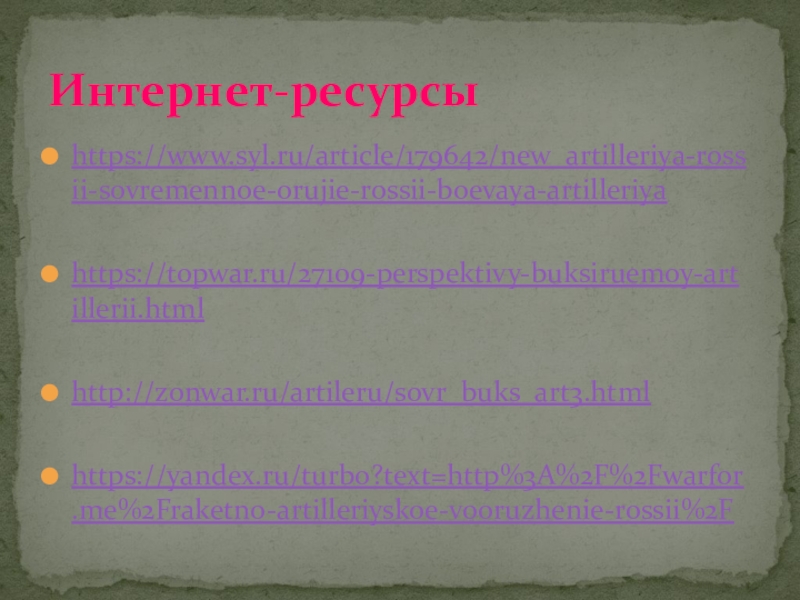 https://www.syl.ru/article/179642/new_artilleriya-rossii-sovremennoe-orujie-rossii-boevaya-artilleriyahttps://topwar.ru/27109-perspektivy-buksiruemoy-artillerii.htmlhttp://zonwar.ru/artileru/sovr_buks_art3.htmlhttps://yandex.ru/turbo?text=http%3A%2F%2Fwarfor.me%2Fraketno-artilleriyskoe-vooruzhenie-rossii%2FИнтернет-ресурсы