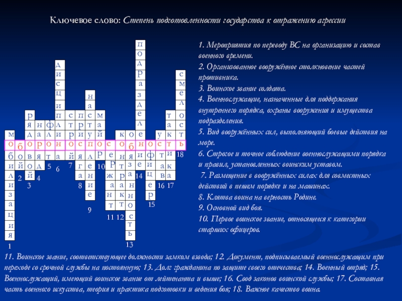 11. Воинское звание, соответствующее должности замком взвода; 12. Документ, подписываемый военнослужащим при переходе со срочной службы на постоянную; 13. Долг гражданина по защите своего отечества; 14. Военный отряд; 15. Военнослужащий, имеющий воинское звание от лейтенанта и выше; 16. Свод законов воинской службы; 17. Составная часть военного искусства, теория и практика подготовки и ведения боя; 18. Важное качество воина.