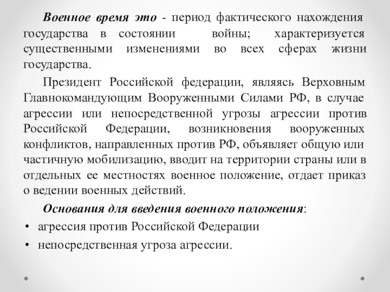 Президент Российской федерации, являясь Верховным Главнокомандующим Вооруженными Силами РФ, в случае агрессии или непосредственной угрозы агрессии против Российской Федерации, возникновения вооруженных конфликтов, направленных против РФ, объявляет общую или частичную мобилизацию, вводит на территории страны или в отдельных ее местностях военное положение, отдает приказ о ведении военных действий.