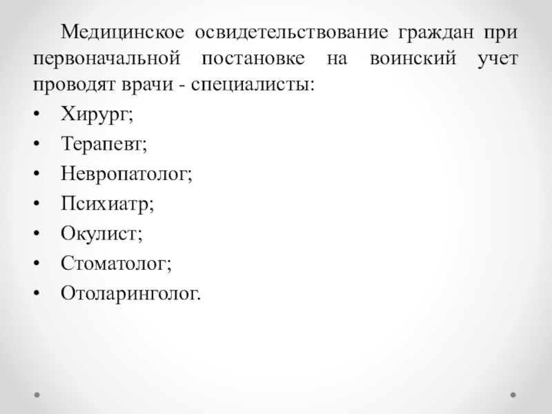 Слайд 9 Медицинское освидетельствование граждан при первоначальной постановке на воинский учет проводят врачи