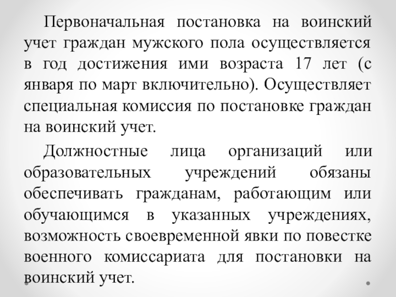 достижения ими возраста 17 лет (с января по март включительно). Осуществляет специальная комиссия по постановке граждан на воинский учет.