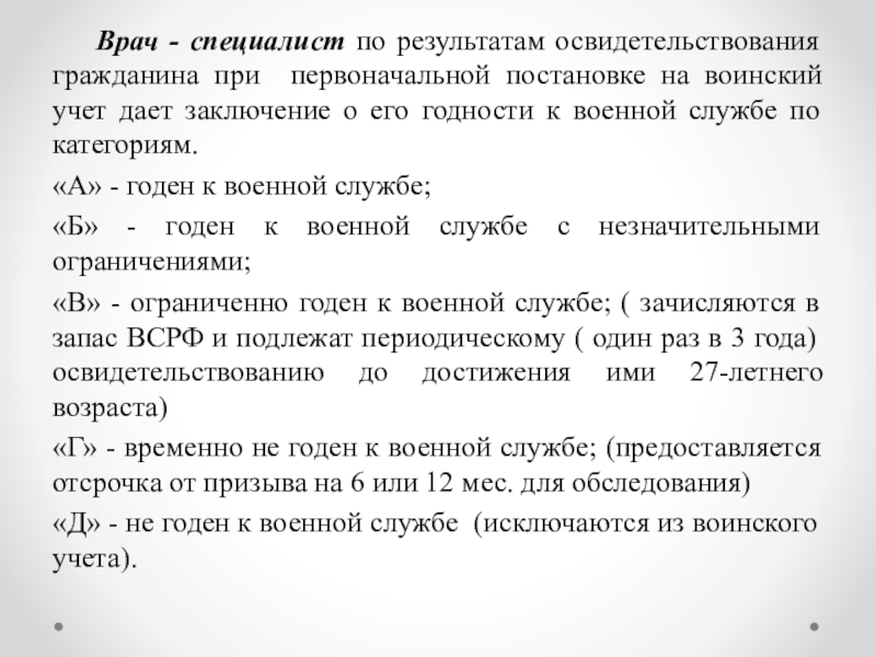Слайд 10 Врач - специалист по результатам освидетельствования гражданина при первоначальной постановке на