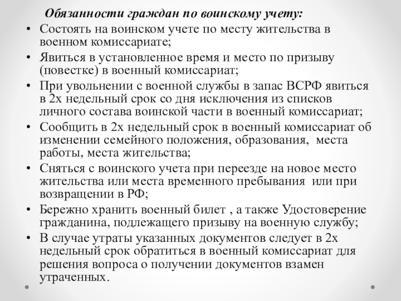 При увольнении с военной службы в запас ВСРФ явиться в 2х недельный срок со дня исключения из списков личного состава воинской части в военный комиссариат;