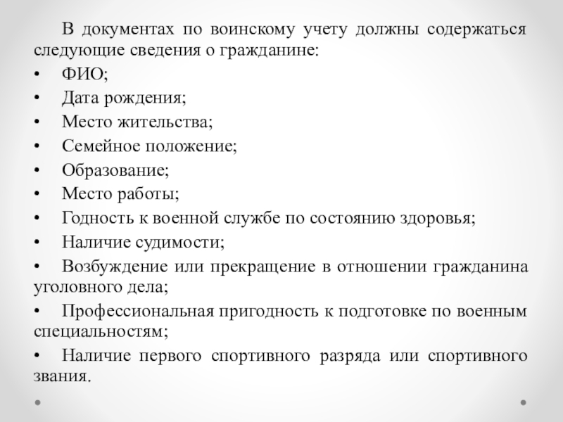 Слайд 6 В документах по воинскому учету должны содержаться следующие сведения о гражданине: