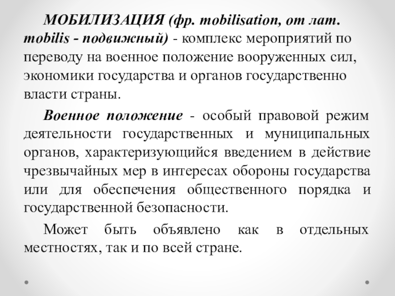 Слайд 16 МОБИЛИЗАЦИЯ (фр. mobilisation, от лат. mobilis - подвижный) - комплекс мероприятий