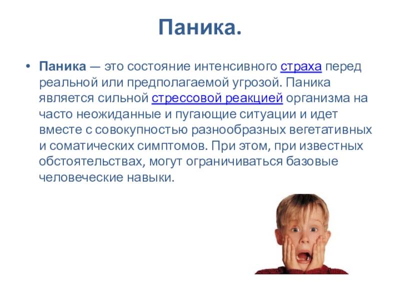Паника — это состояние интенсивного страха перед реальной или предполагаемой угрозой. Паника является сильной стрессовой