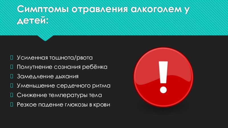 Симптомы отравления алкоголем у детей:Усиленная тошнота/рвотаПомутнение сознания ребёнкаЗамедление дыханияУменьшение сердечного ритмаСнижение температуры телаРезкое падение глюкозы в крови