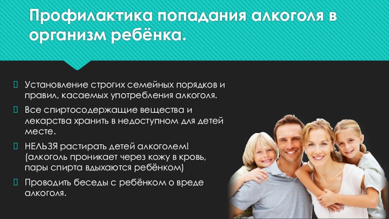 Слайд 7Профилактика попадания алкоголя в организм ребёнка.