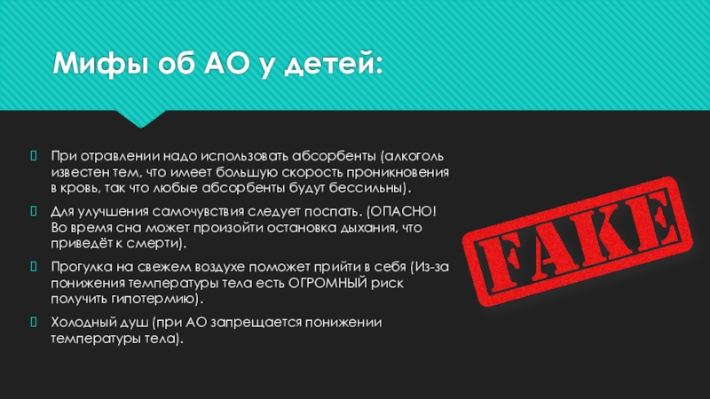 Мифы об АО у детей:При отравлении надо использовать абсорбенты (алкоголь известен тем, что имеет большую скорость проникновения