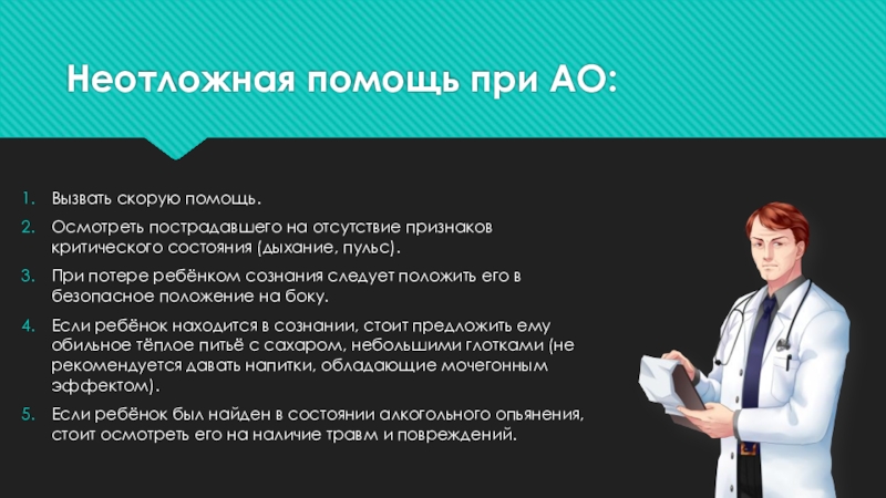 Неотложная помощь при АО:Вызвать скорую помощь.Осмотреть пострадавшего на отсутствие признаков критического состояния (дыхание, пульс).При потере ребёнком сознания