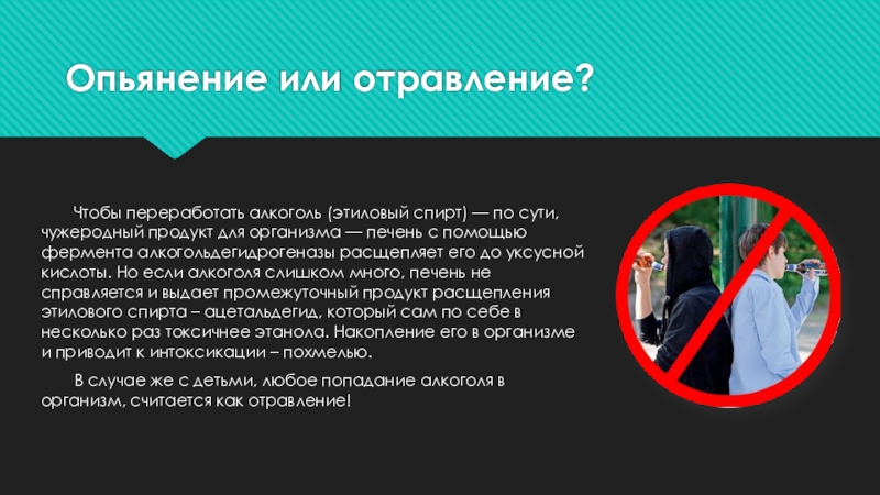 Опьянение или отравление?	Чтобы переработать алкоголь (этиловый спирт) — по сути, чужеродный продукт для организма — печень с