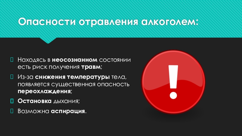 Опасности отравления алкоголем:Находясь в неосознанном состоянии есть риск получения травм;Из-за снижения температуры тела, появляется существенная опасность переохлаждения;Остановка