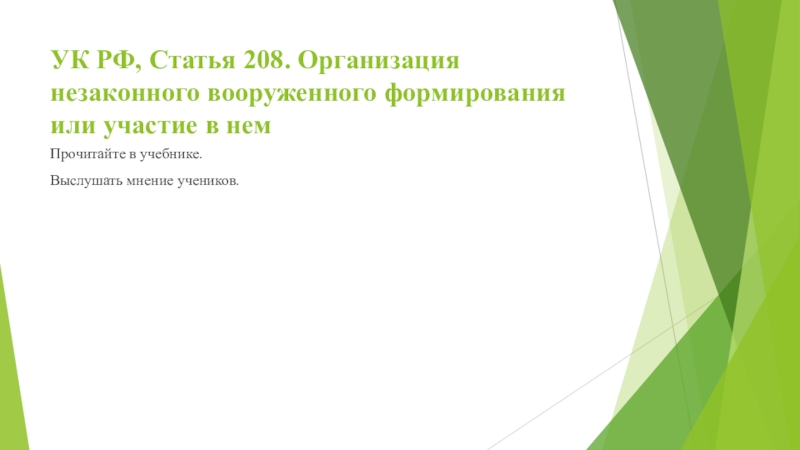 Слайд 16УК РФ, Статья 208. Организация незаконного вооруженного формирования или участие в