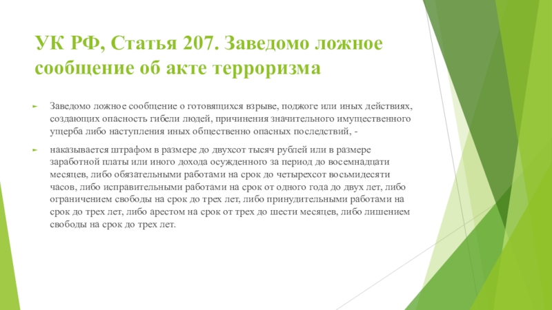 Слайд 14УК РФ, Статья 207. Заведомо ложное сообщение об акте терроризма