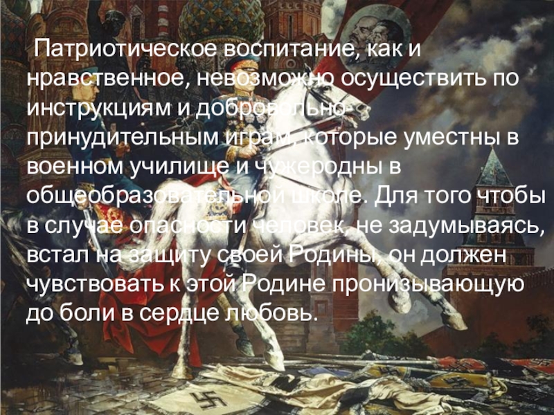 Слайд 14 Патриотическое воспитание, как и нравственное, невозможно осуществить по инструкциям и добровольно-принудительным