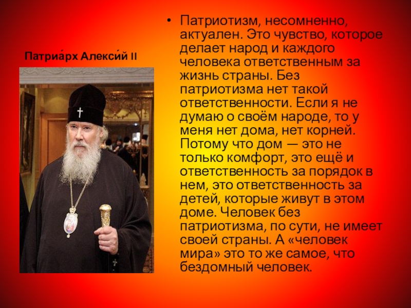 каждого человека ответственным за жизнь страны. Без патриотизма нет такой ответственности. Если я не думаю о своём народе, то у меня нет дома, нет корней. Потому что дом — это не только комфорт, это ещё и ответственность за порядок в нем, это ответственность за детей, которые живут в этом доме. Человек без патриотизма, по сути, не имеет своей страны. А «человек мира» это то же самое, что бездомный человек.