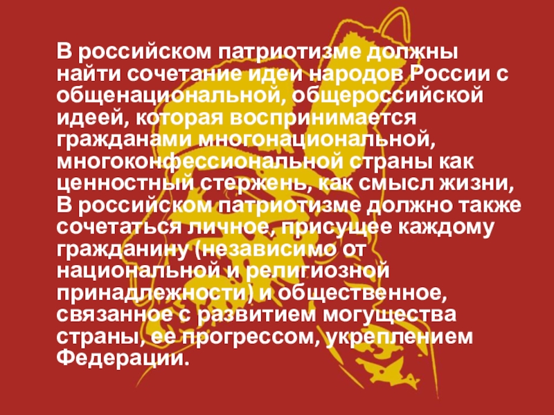 с общенациональной, общероссийской идеей, которая воспринимается гражданами многонациональной, многоконфессиональной страны как ценностный стержень, как смысл жизни, В российском патриотизме должно также сочетаться личное, присущее каждому гражданину (независимо от национальной и религиозной принадлежности) и общественное, связанное с развитием могущества страны, ее прогрессом, укреплением Федерации.